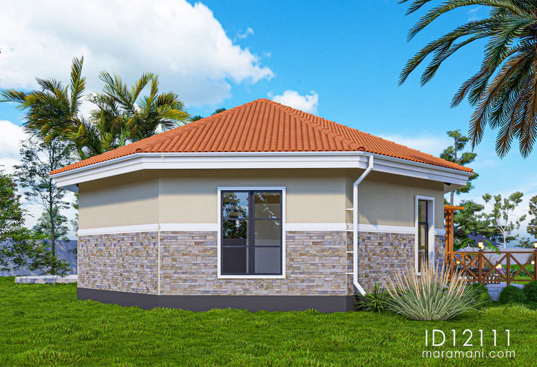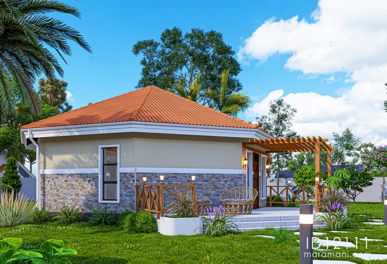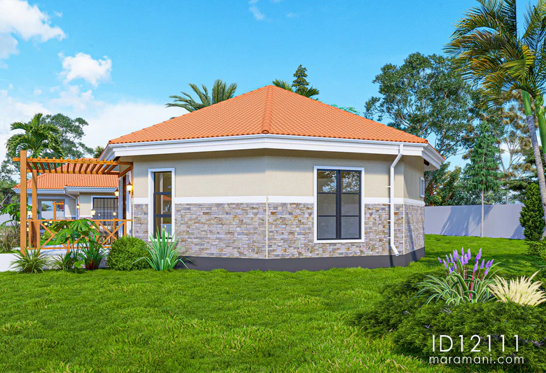 2 Room 1-Bath house plan is a compact and efficient layout. It offers a charming and cozy space for a small family or couple. The house design features a unique octagonal shape that maximizes space. It has a living area, dining space, and kitchen. There are two rooms. These rooms share a bathroom. There is also a spacious front terrace. It serves as an inviting outdoor space for relaxation, dining, or entertaining while enjoying the surrounding views. This 2 Room 1-Bath house plan covers an area of 125sqm. This excludes setbacks and parking. This style is an excellent choice for suburban or countryside living.