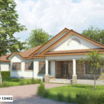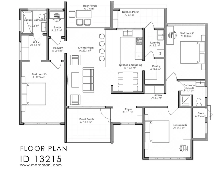 3 bedroom building plan which places the master bedroom on one side and 2 bedrooms for kids on the other side separated by a spacious lounge and an open kitchen. A foyer greets you when entering the house and creates a beautiful buffer where you can hang works of art and have a seating arrangement. Here you can also place your shoes and hang your coat. The plan also includes an open kitchen and dining, laundry, pantry, 3 verandas, study room and a breakfast counter.